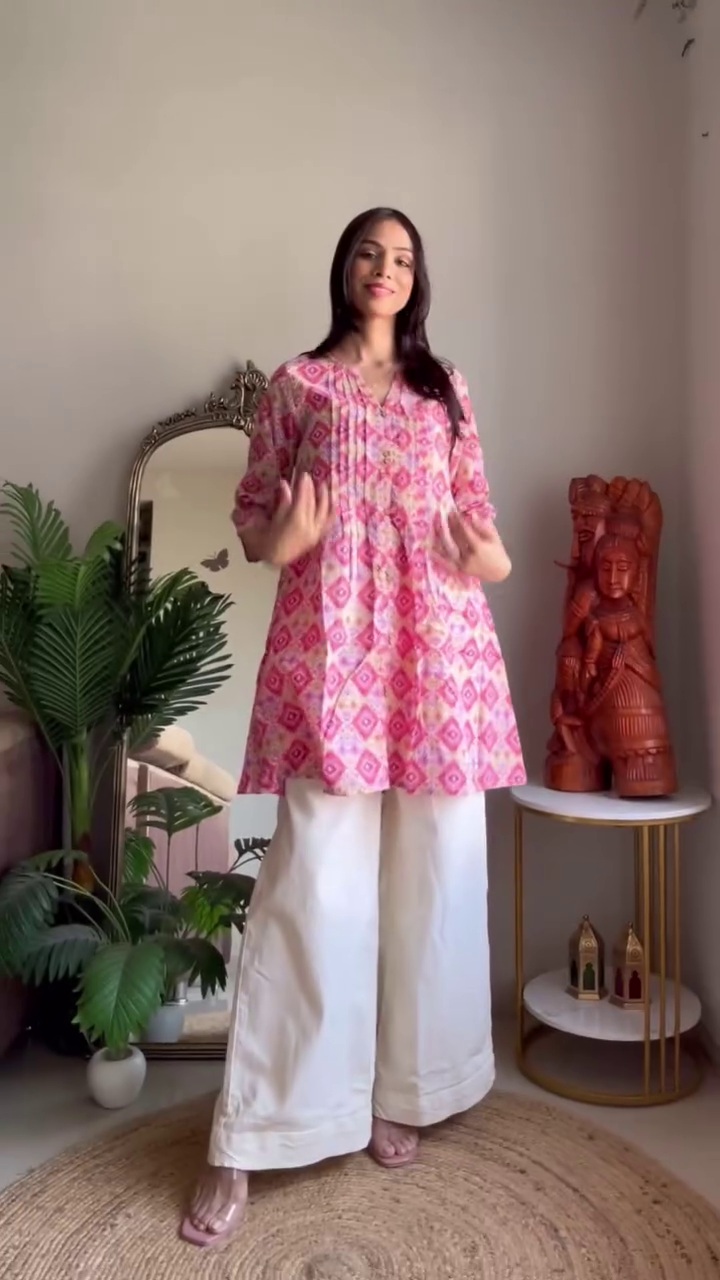 The kurta showcases a traditional ikat-inspired geometric print in shades of pink, white, and hints of yellow, adding depth and vibrancy to the look. Fine pleated detailing runs down the front panel, giving the outfit a structured yet flowy appeal. The design strikes a perfect balance between ethnic charm and modern casual wear.
