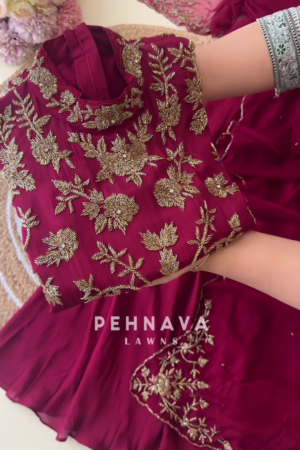 This gorgeous red lehenga set features intricate golden embroidery paired with a navy blue blouse adorned with floral sequins and detailed embellishments. The set includes a beautifully pleated lehenga, a designer blouse with scalloped edges, and a matching dupatta. Perfect for weddings, receptions, and festive occasions, this outfit offers a regal yet trendy look.