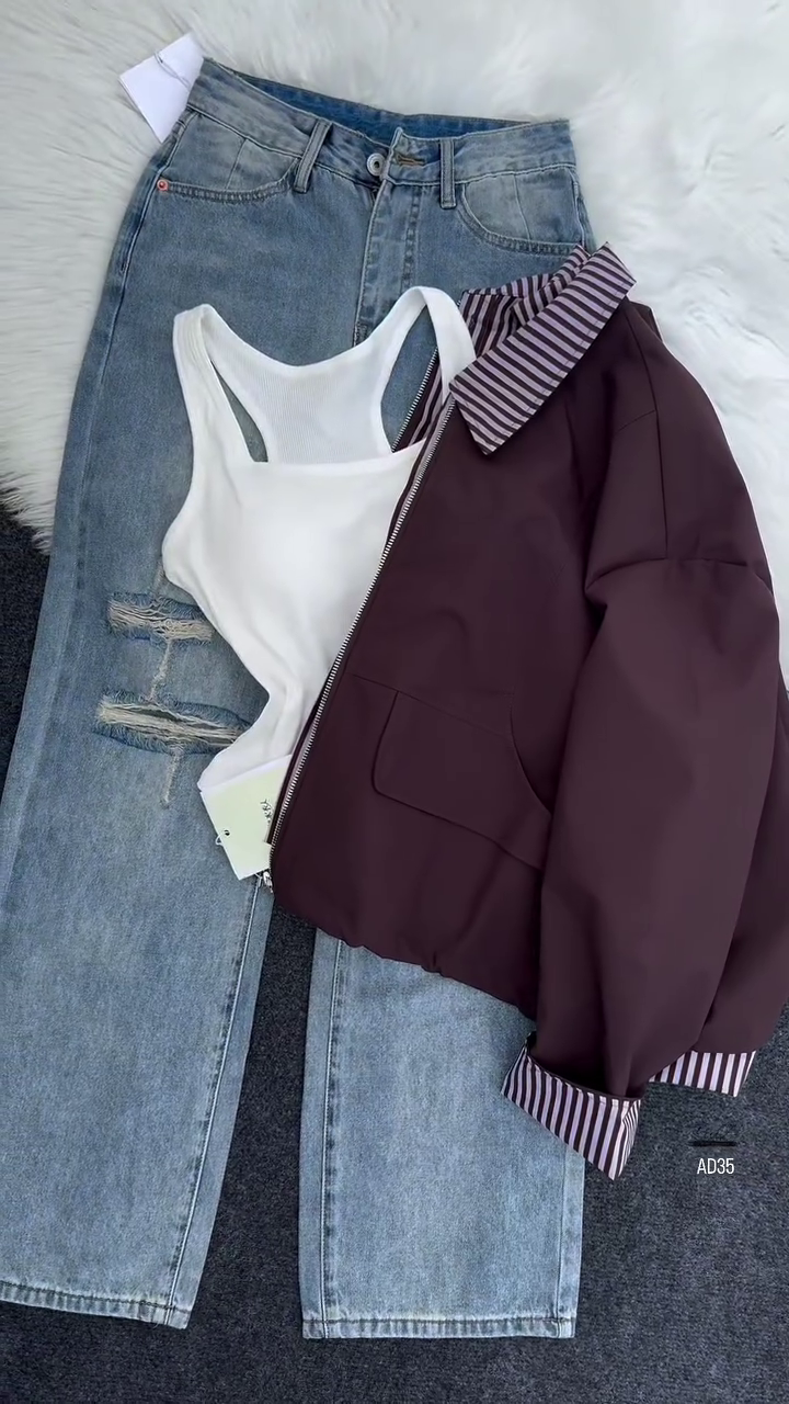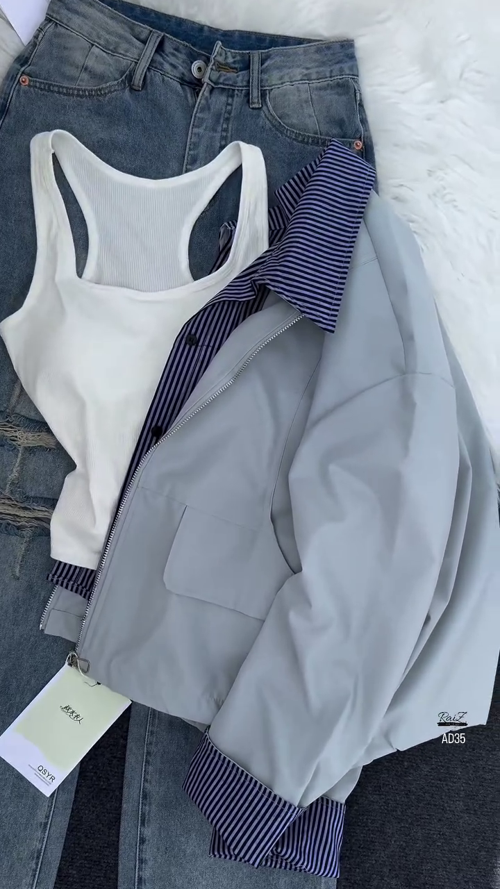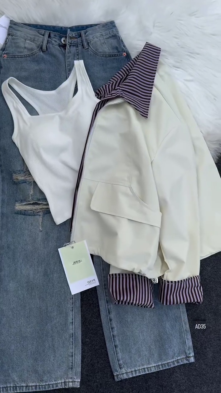 Women’s Casual Zip-Up Jacket with Striped Lining – Navy Blue